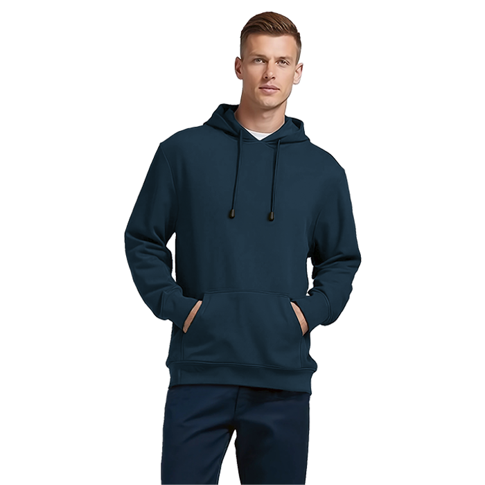 - Front kangaroo pocket with double needle stitching